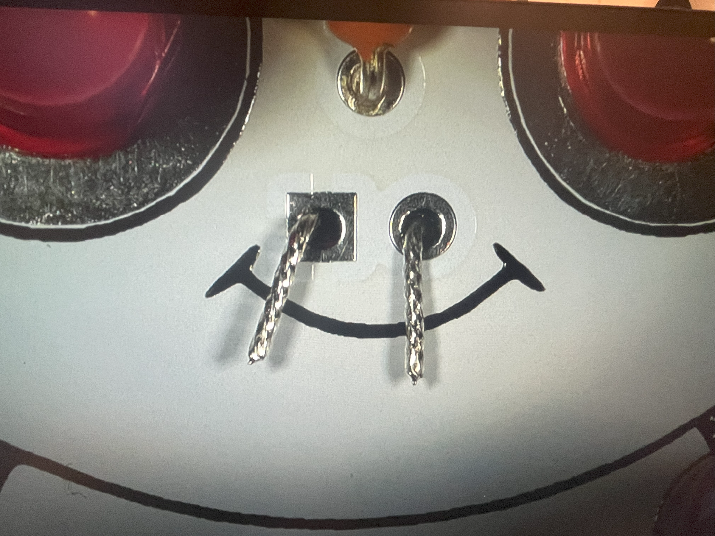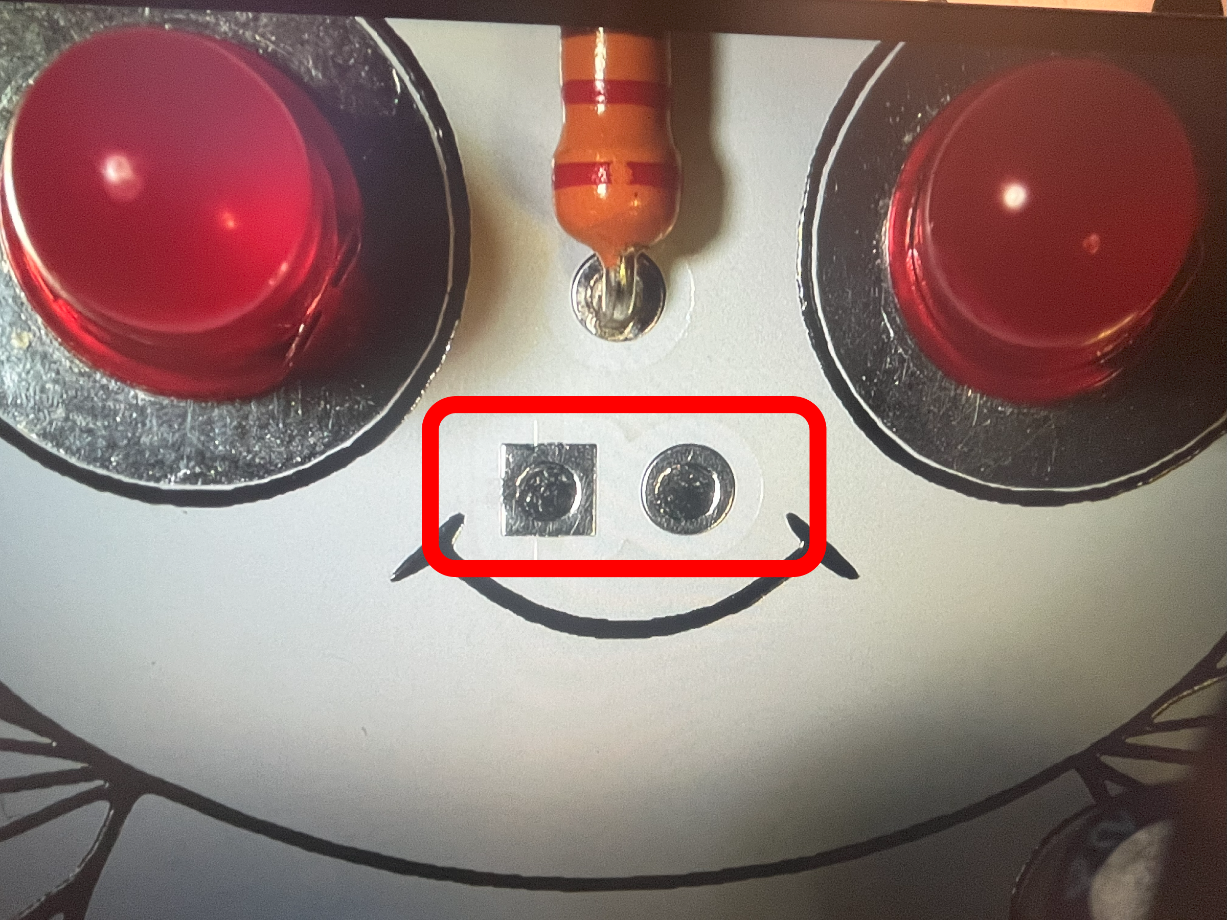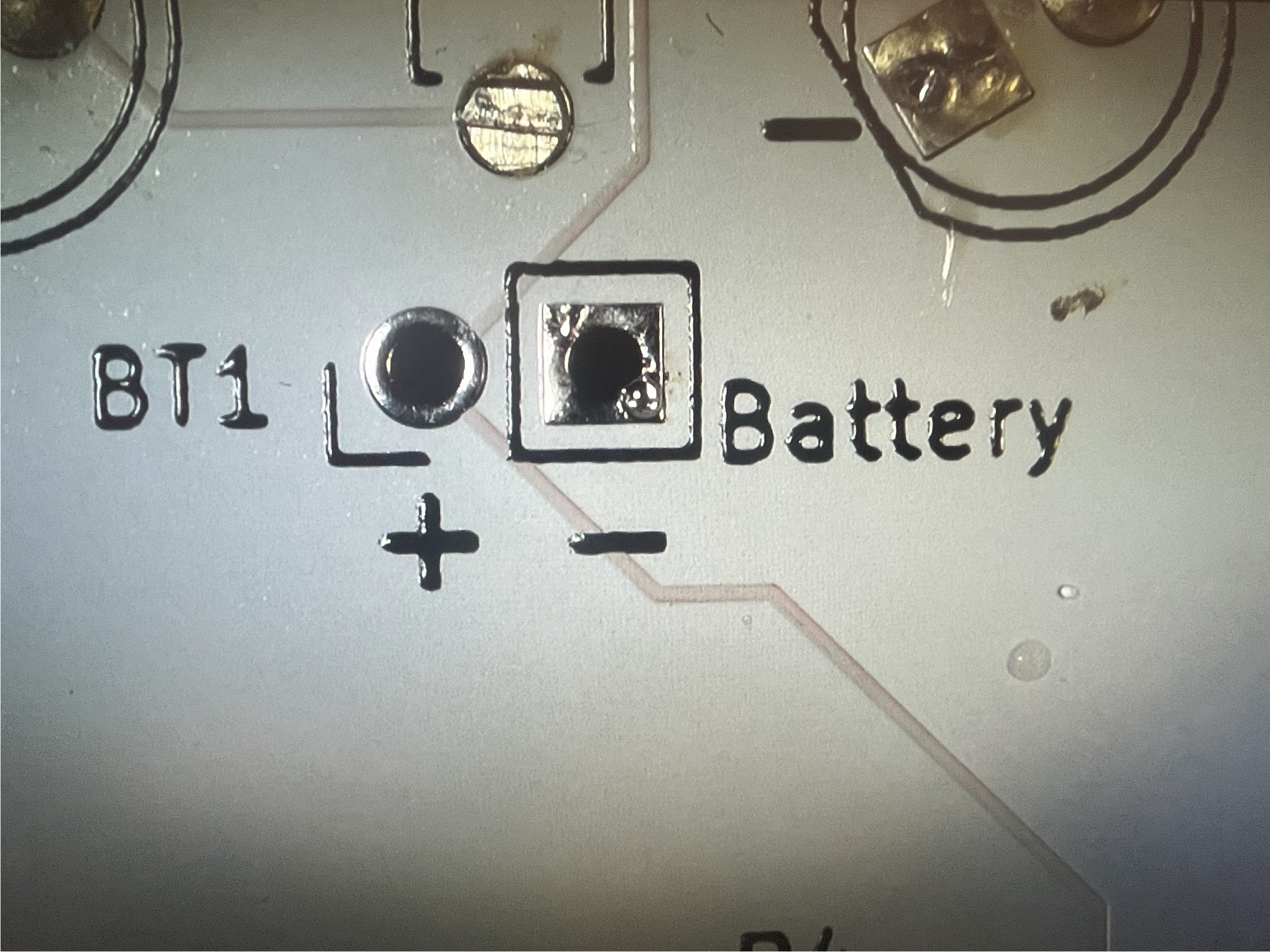 The battery 9V clip wires (leads) is the only part inserted from the back of the board and soldered on the face of the Cicada Invada. When done, it will look like 2 silver nostrils.