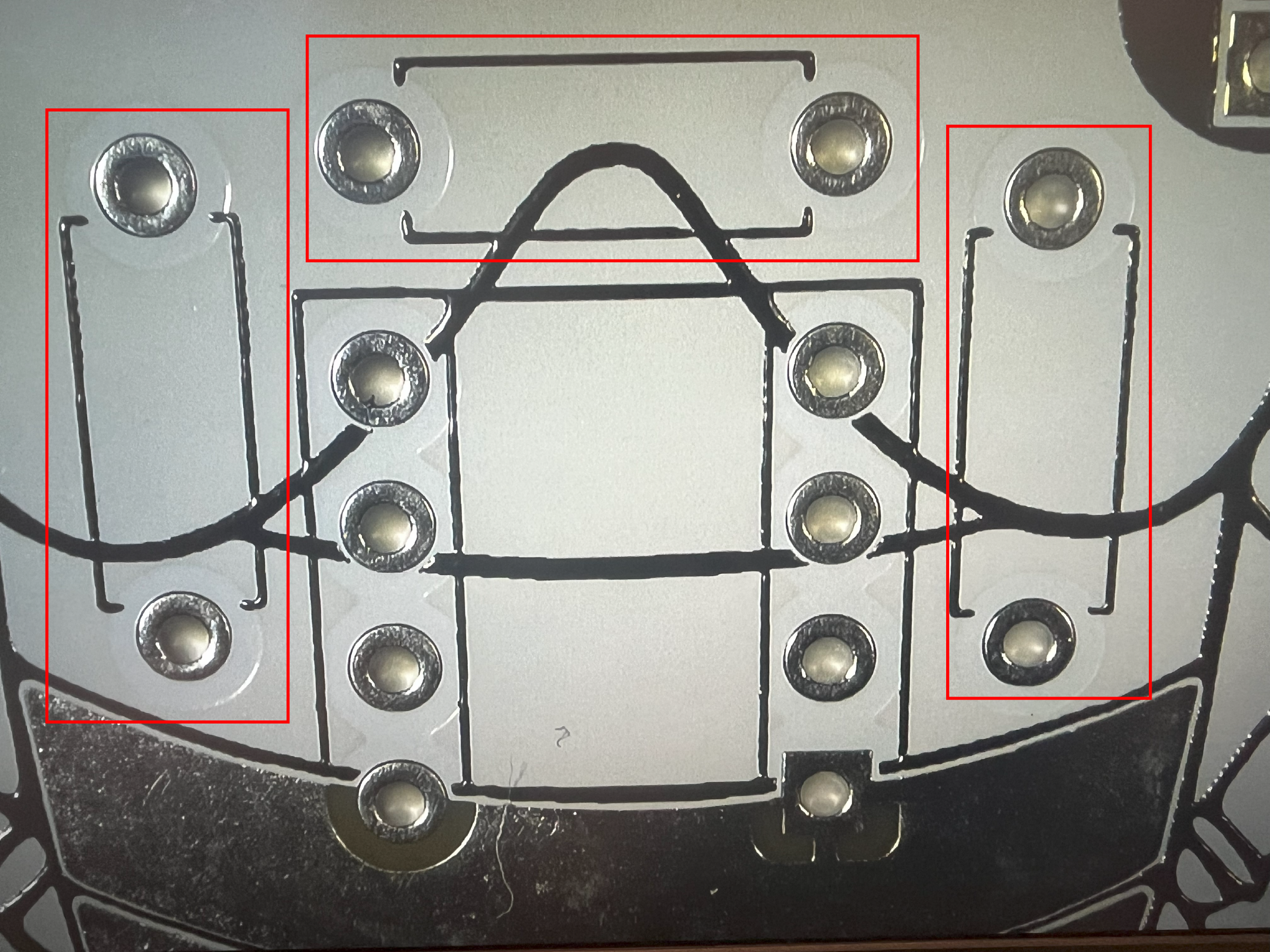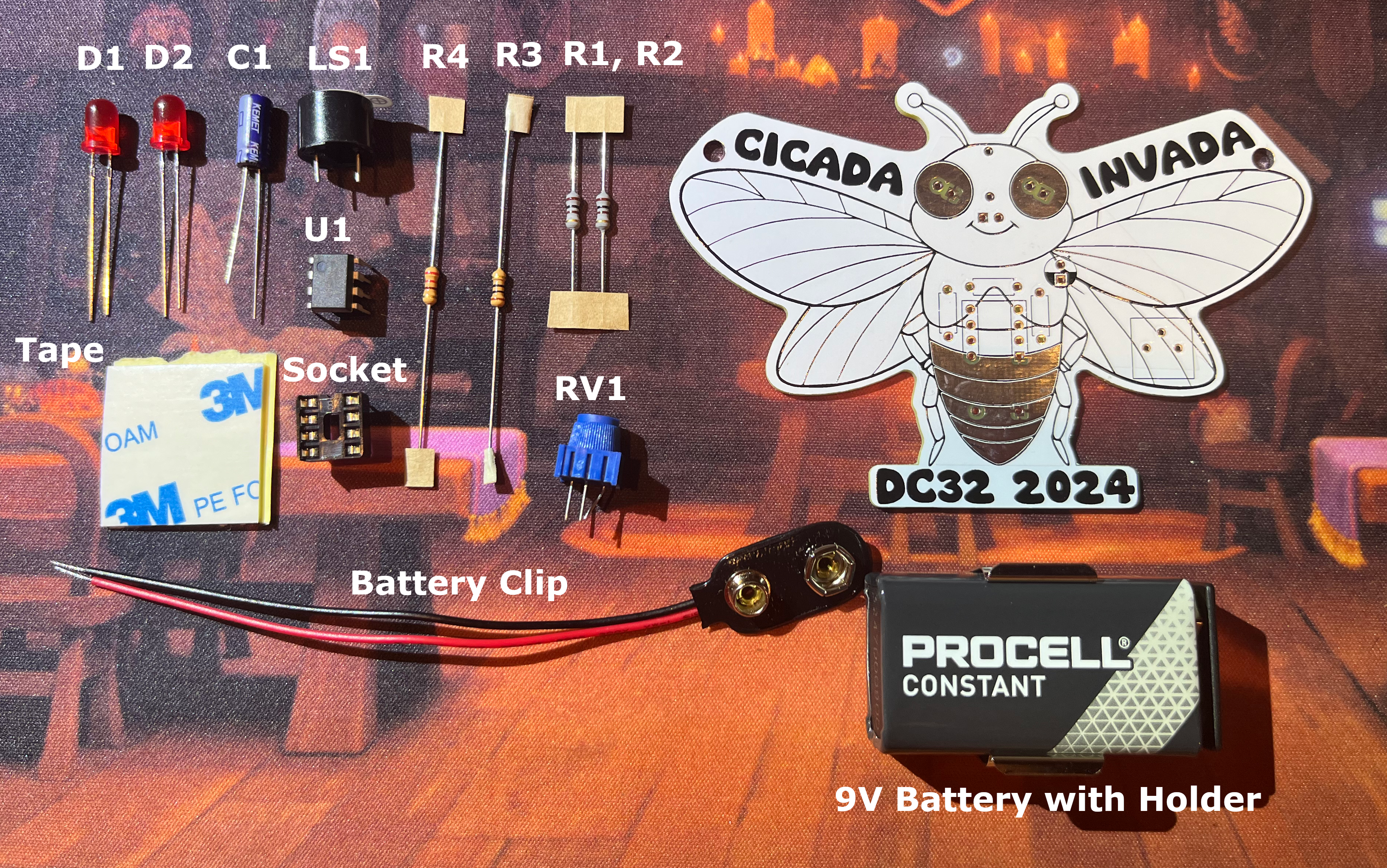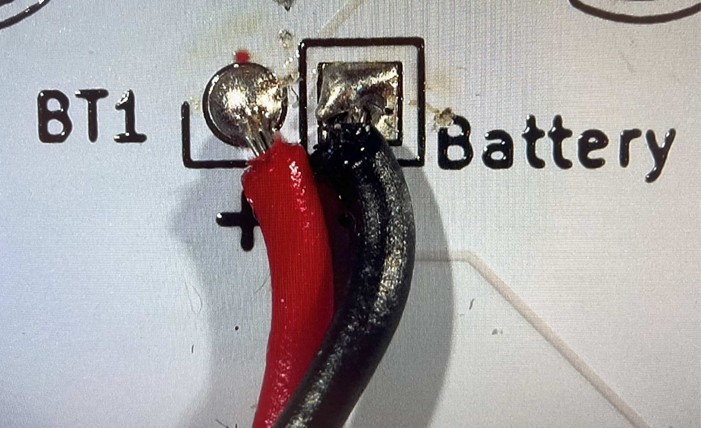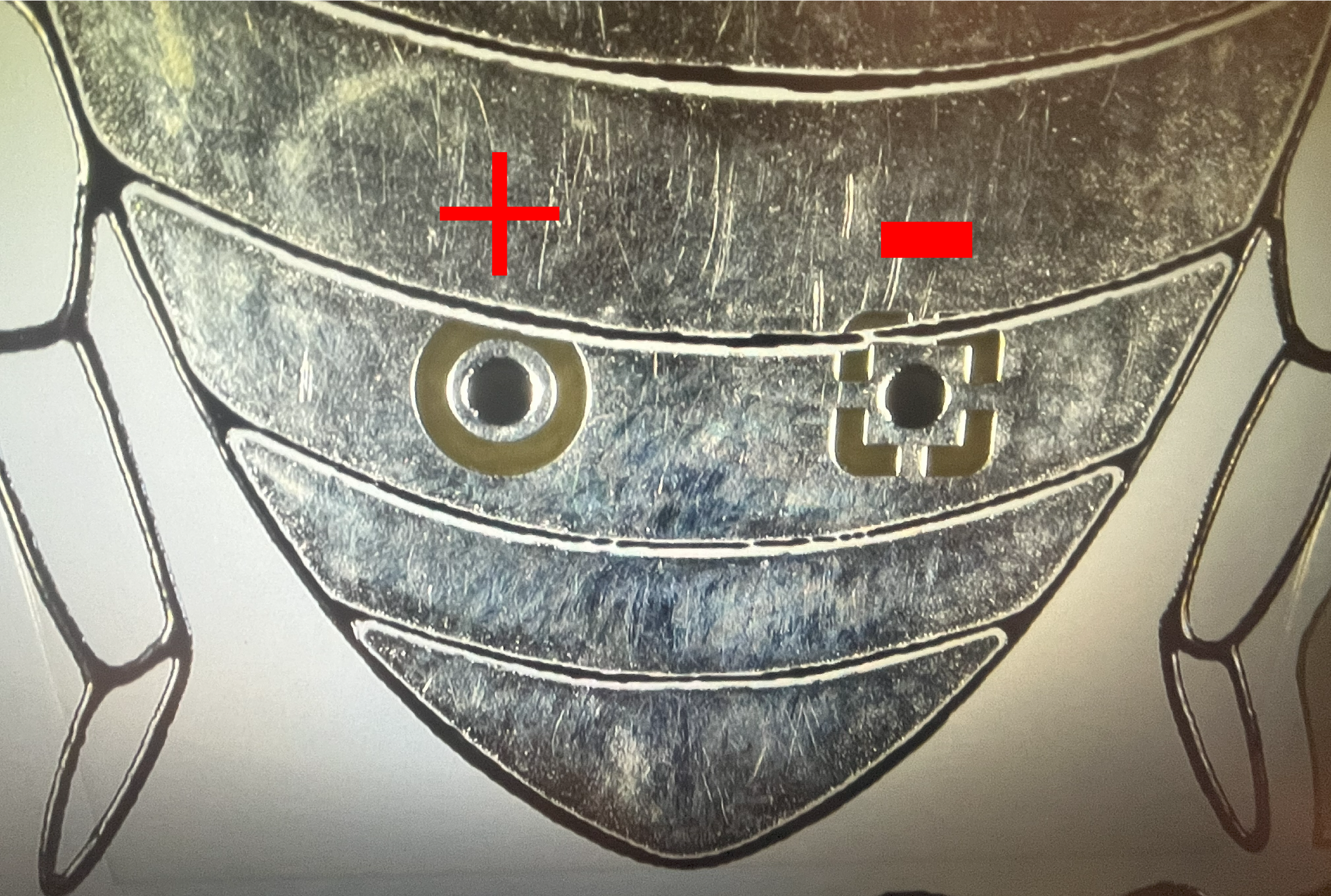 The battery 9V clip wires (leads) is the only part inserted from the back of the board and soldered on the face of the Cicada Invada. When done, it will look like 2 silver nostrils.