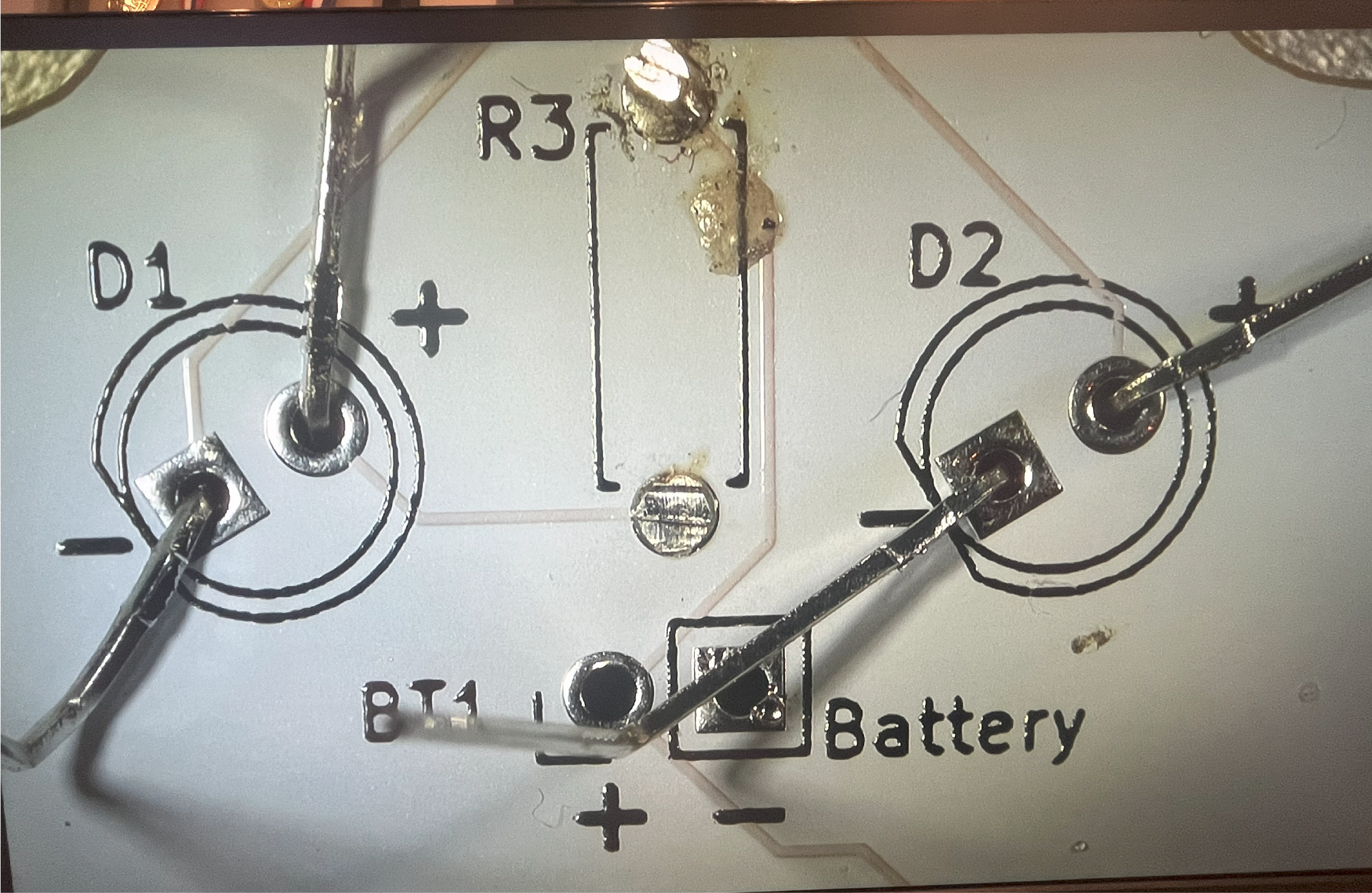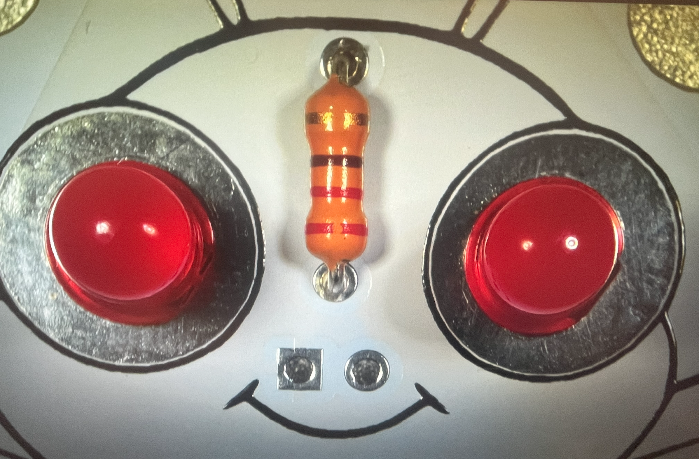 Carefully look at the end of each LED (Light Emitting Dioide) and you will see that the two pins vary in length. Make sure the longest pin is inserted as shown in this picture. This is super important because if it's not done correctly, then the Cicada Invada's eyes won't light up. You can start with either D1 or D2.