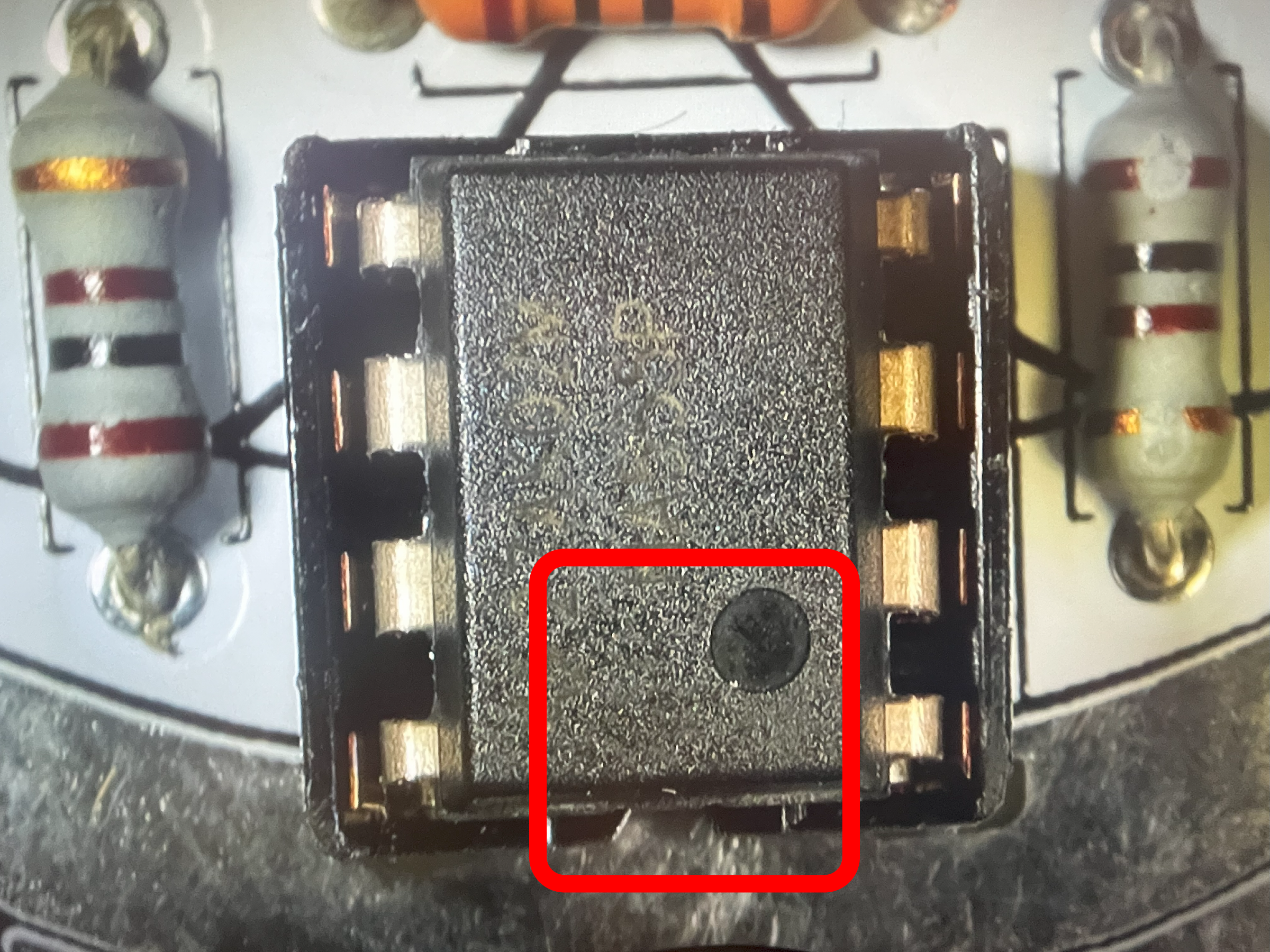 Now is a safe time to insert the 555 timer into the DIP-8 socket you soldered previously. Notice the 555 timer pin are wider than the socket? Slowly insert the 555 timer into one side, make sure the pins on the other side are correctly aligned and then gently but with some force, push the 555 timer into the socket. Check that no pins missed the socket holes. If so, remove the 555 timer, straighten the bent pins and try again.