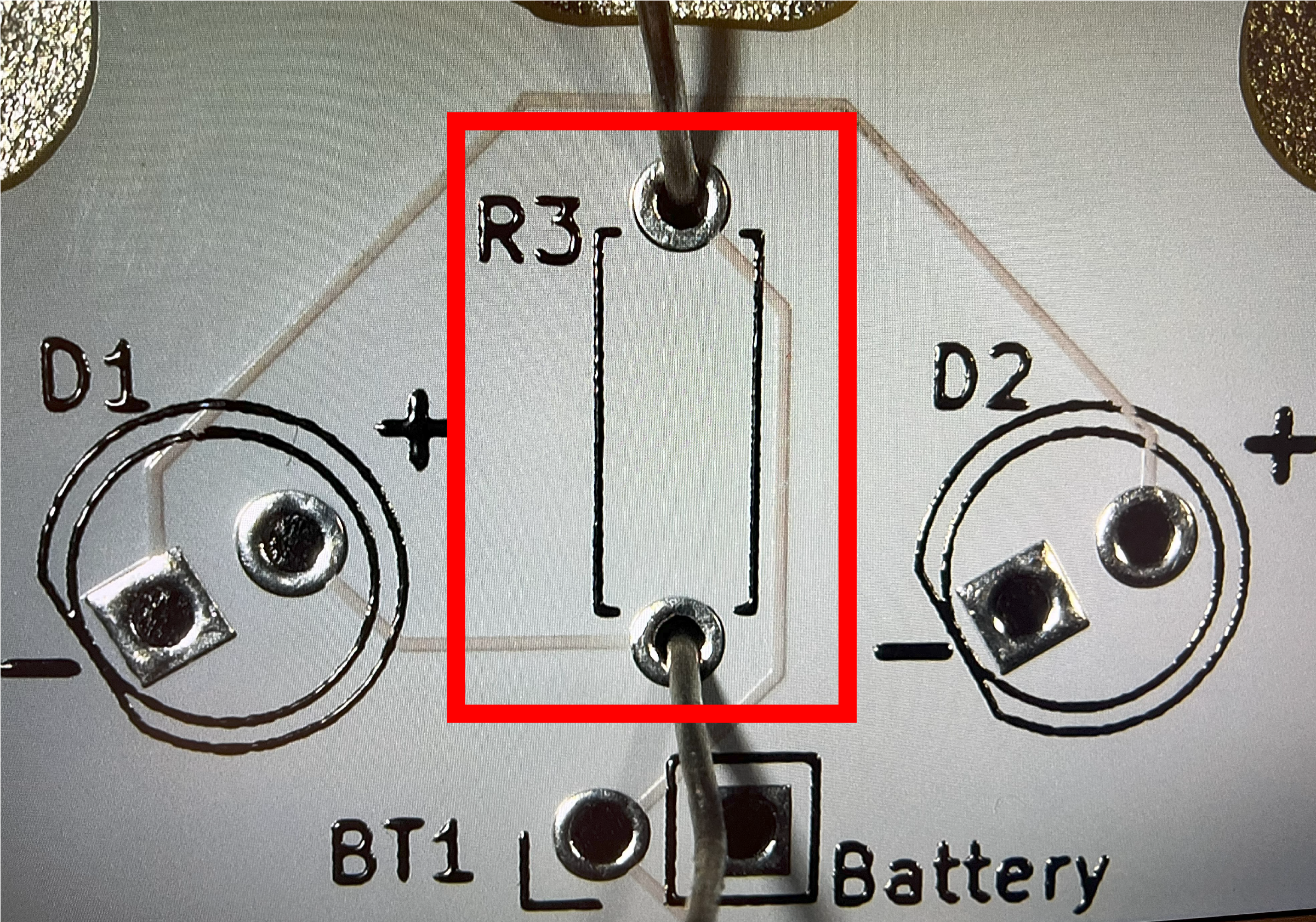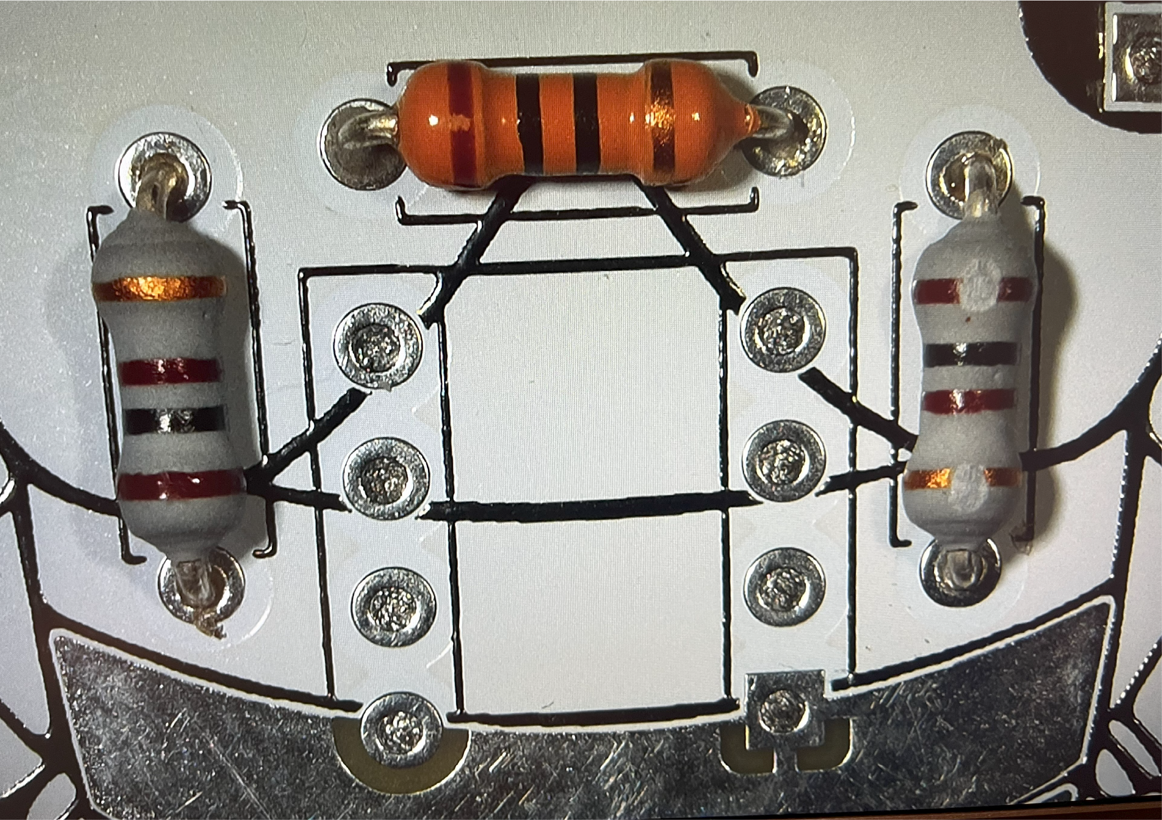 Resistors are typically a great place to start because they are the closest to the printed circuit board (PCB), and are not very tall. Make sure you are looking at the front of the board, which is the side the cicada is looking at you. Always check the pictures in each section before starting. You should know the before and after of each part before you place the soldering iron down.