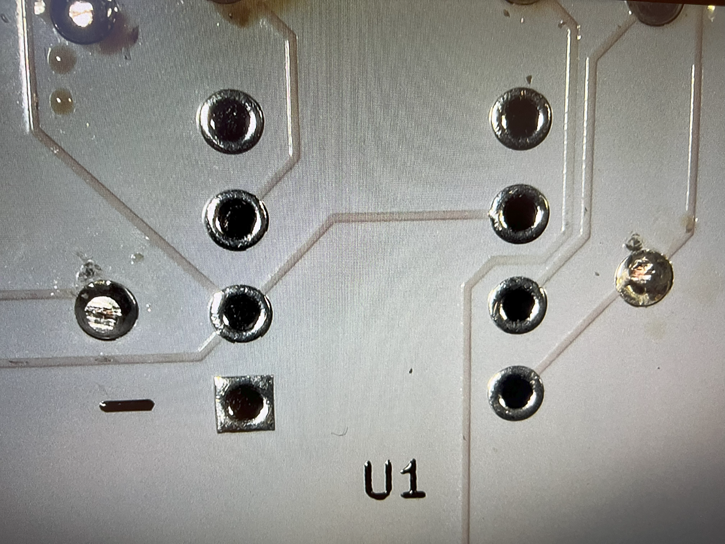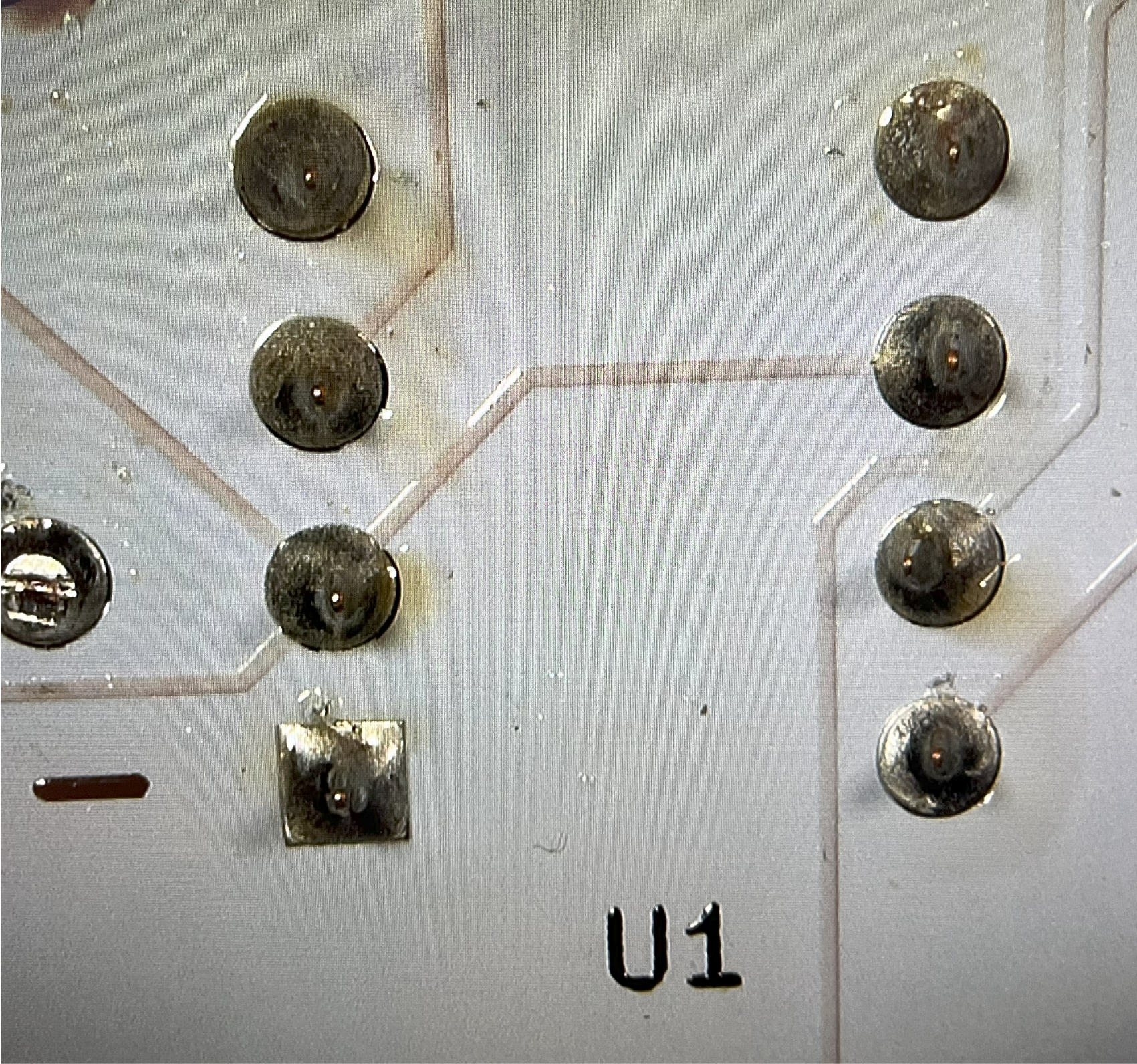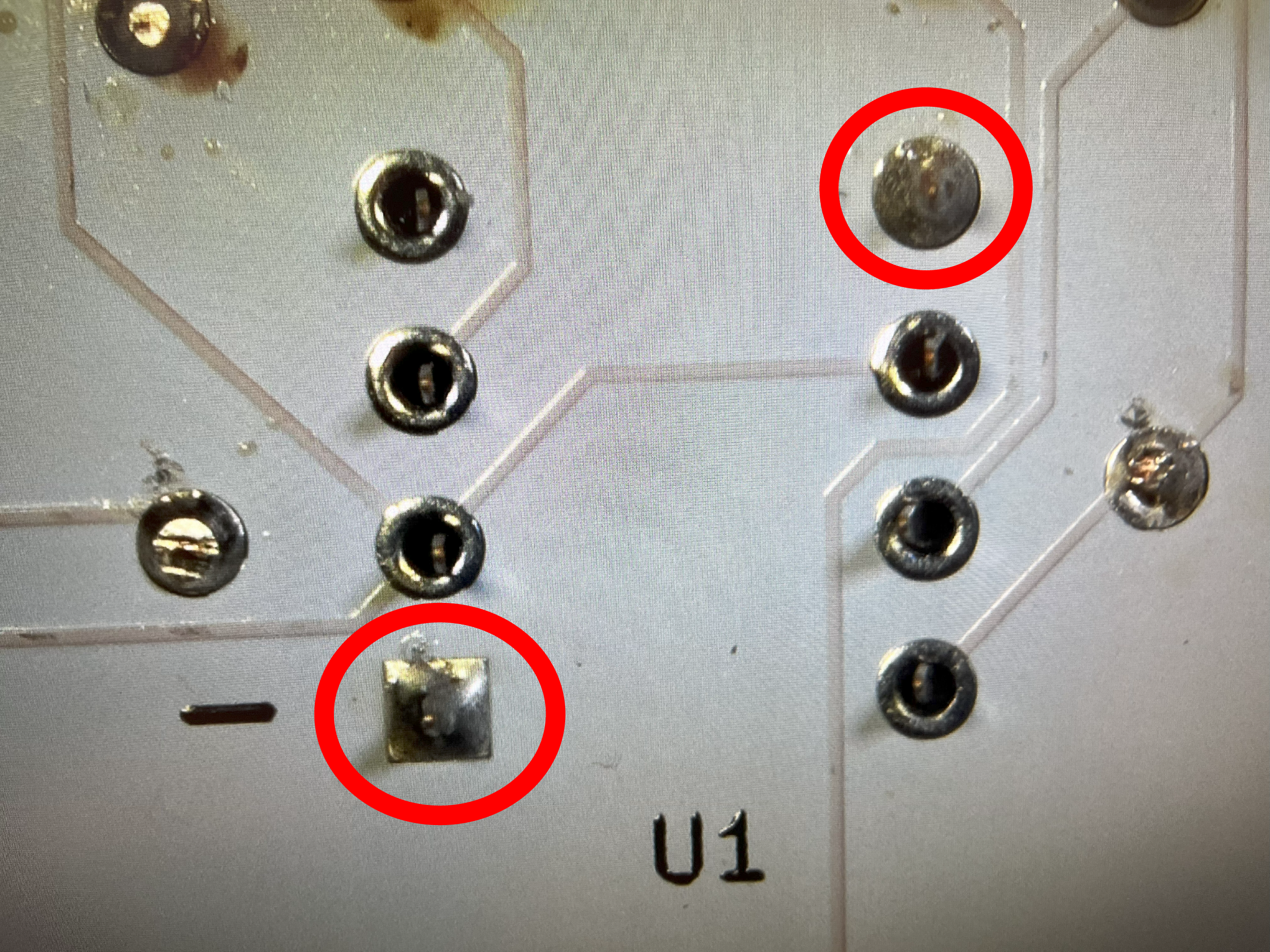 In the blue triangle, you can see the flux is doing a great job keeping the solder on the pads and around the wires.