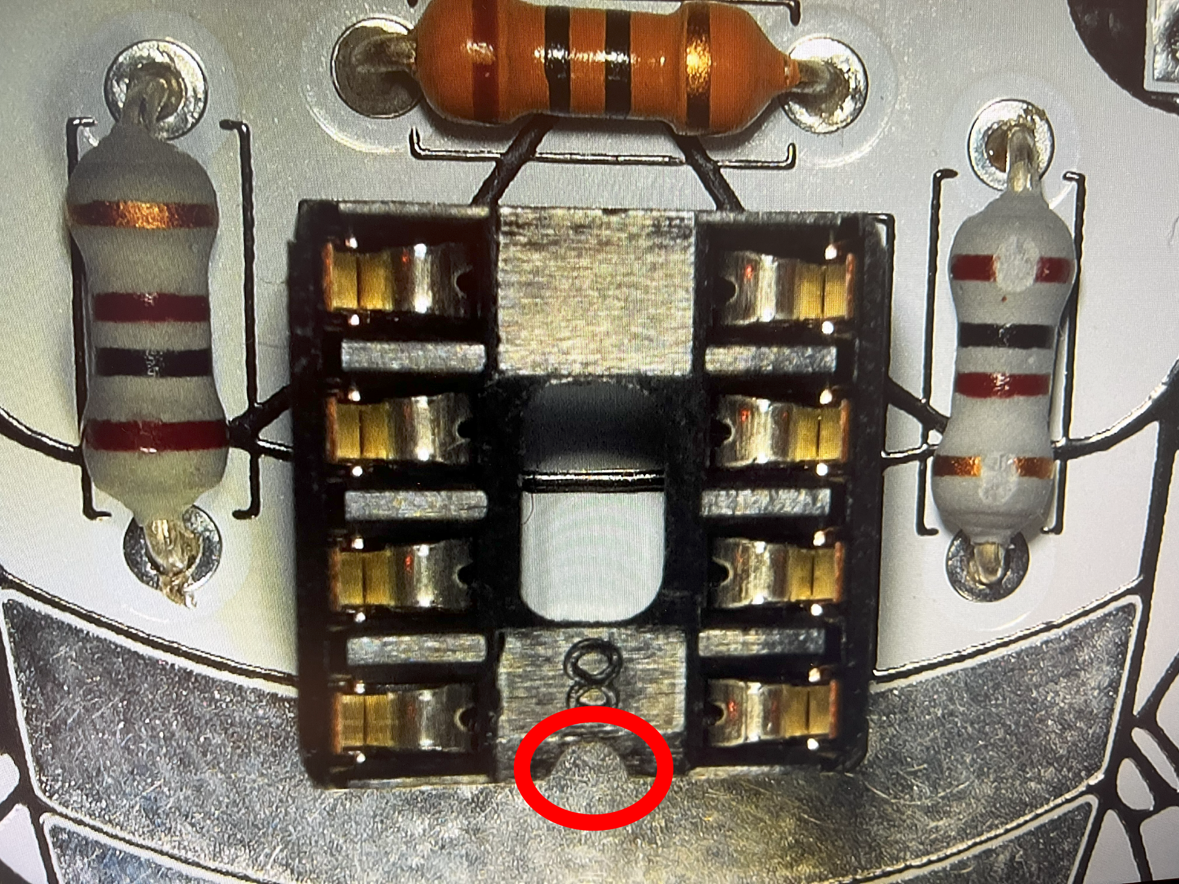 Locate the reference U1 for the 555 timer socket. Orient the socket so the tab faces downward towards the Cicada Invada's tail. You want to solder opposite corner pins first to make sure that the socket is securely placed into position. Once you know the socket is flush to the board, solder the remaining pins. IMPORTANT: Do not add the 555 timer IC chip until everything is soldered.